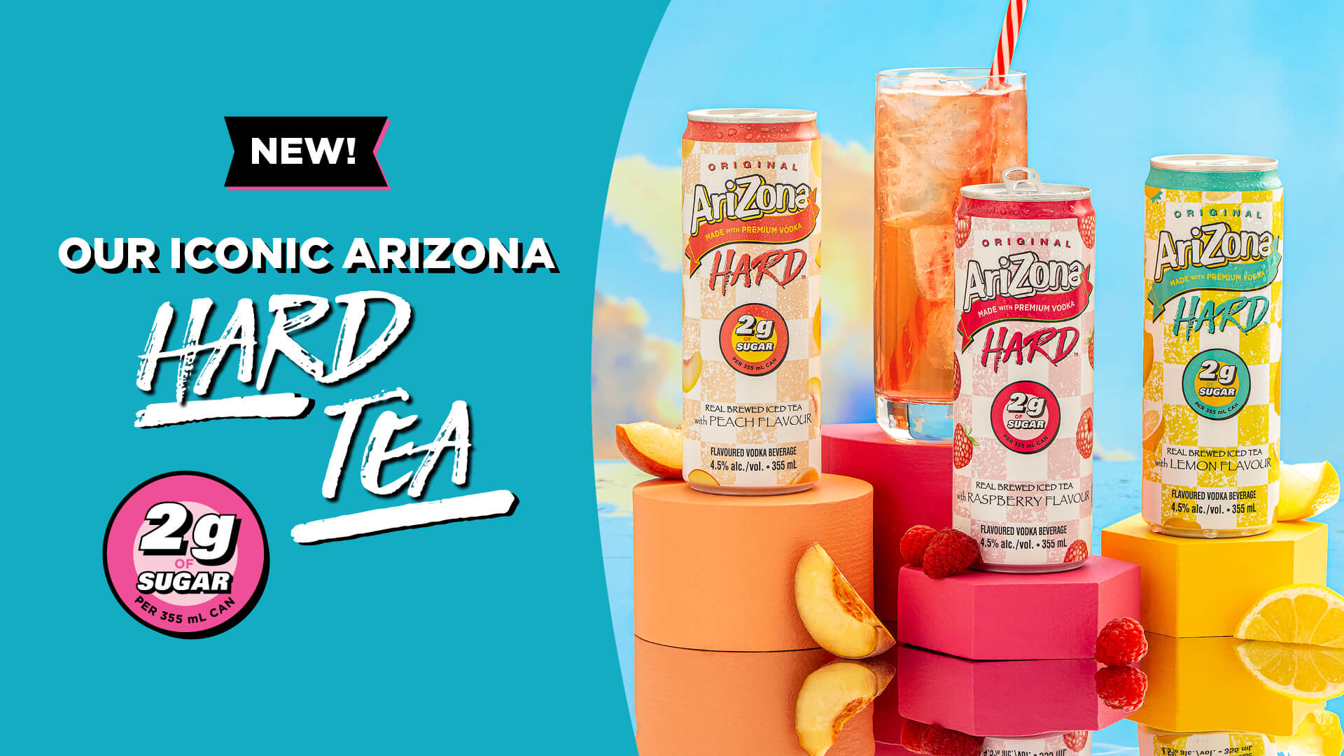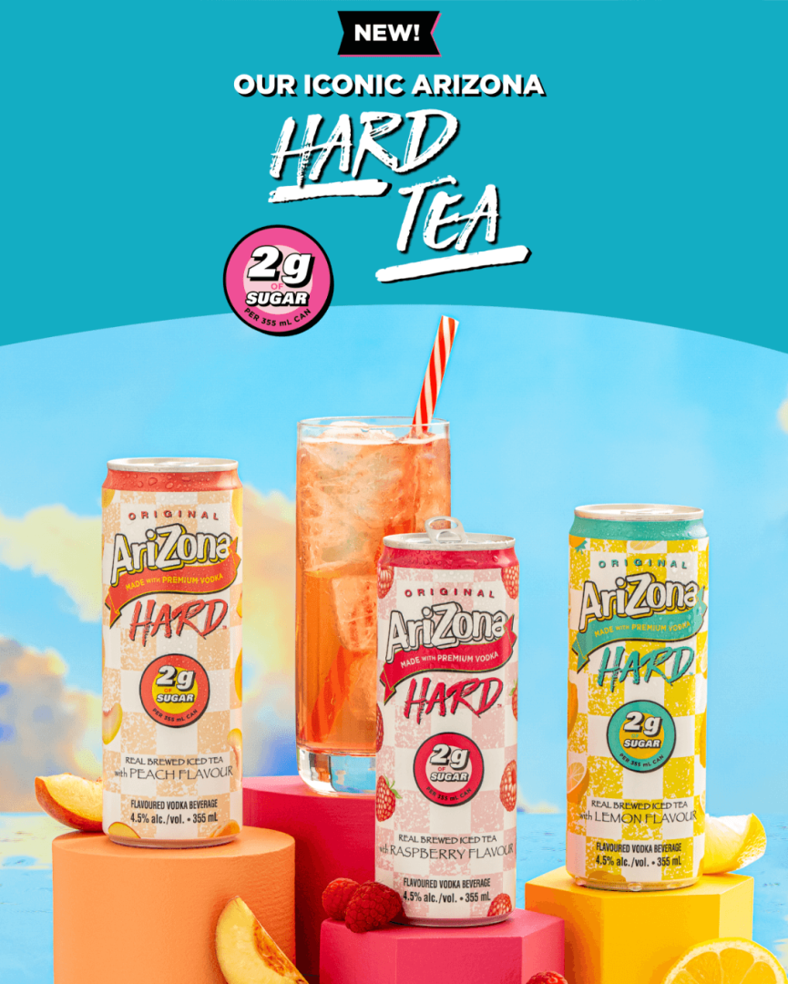 Introducing AriZona Hard 2G now made with only 2g of sugar 110 calories or less and 4.5% alcohol, this pack brings you to the lighter side of the tea flavours you know and love. Now available in three refreshing flavors—Lemon, Peach, and Raspberry!